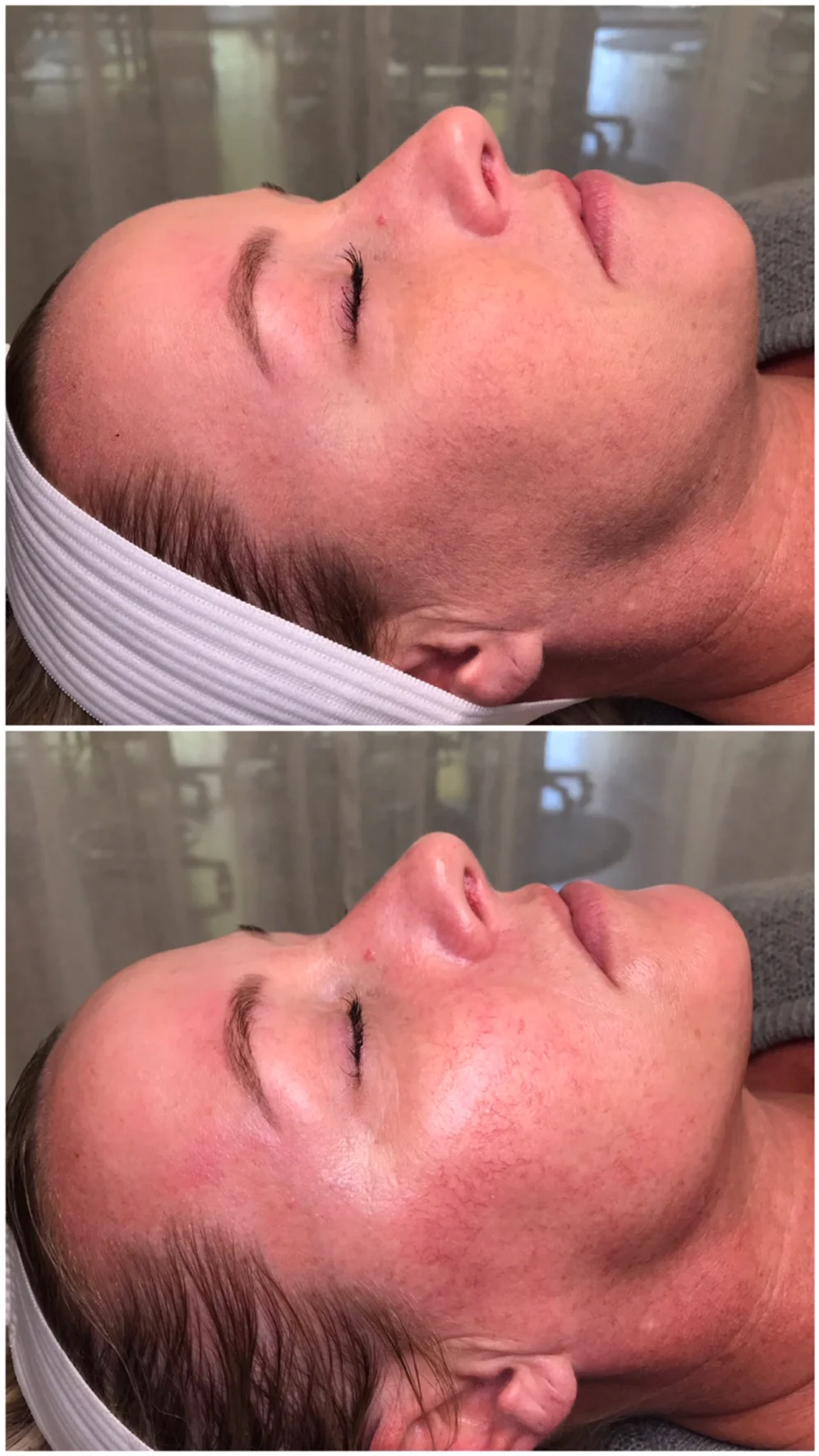 Before and after skin treatment on woman's face, showing improved texture and redness.