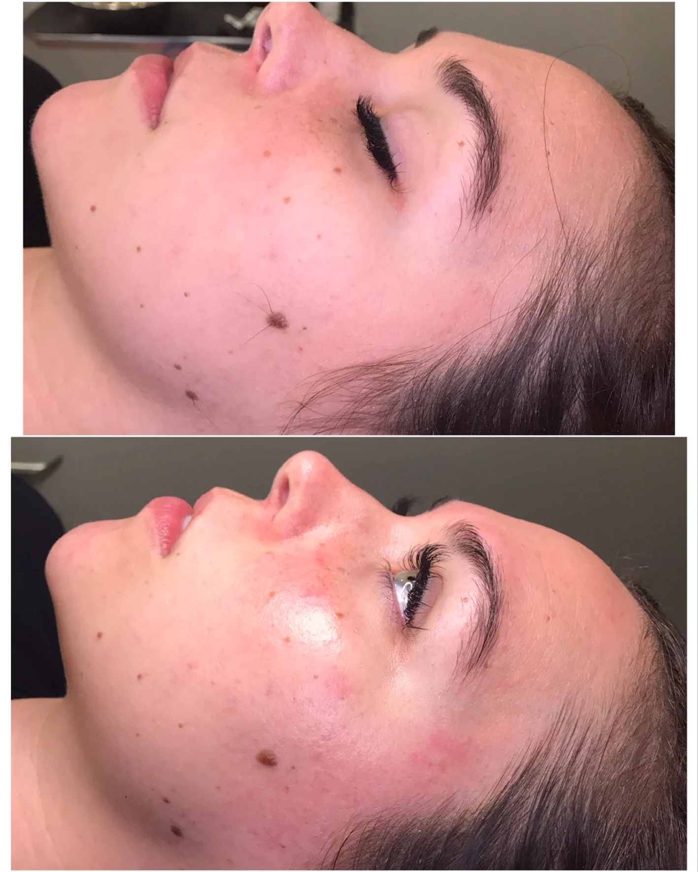 Side-by-side comparison of a woman's face before and after a skincare treatment, showing smoother and more radiant skin.