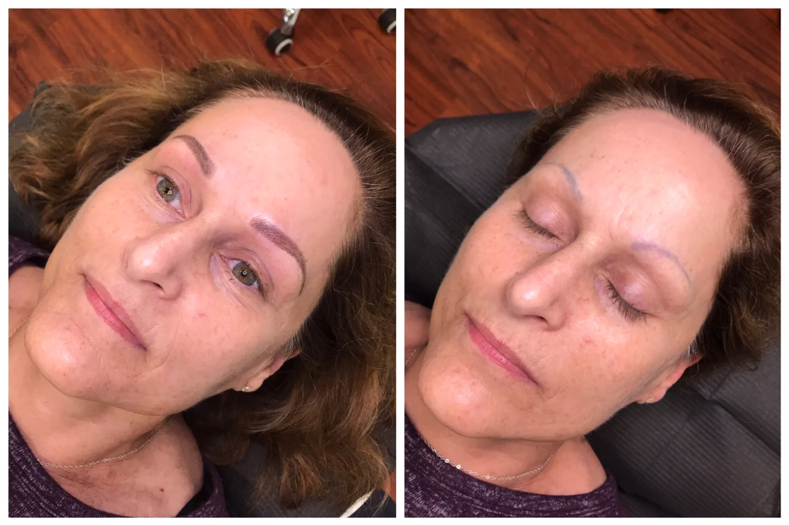 Before and after eyebrow microblading showing enhanced eyebrow shape and fullness.