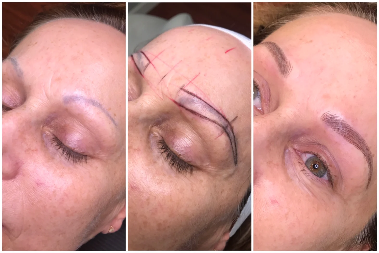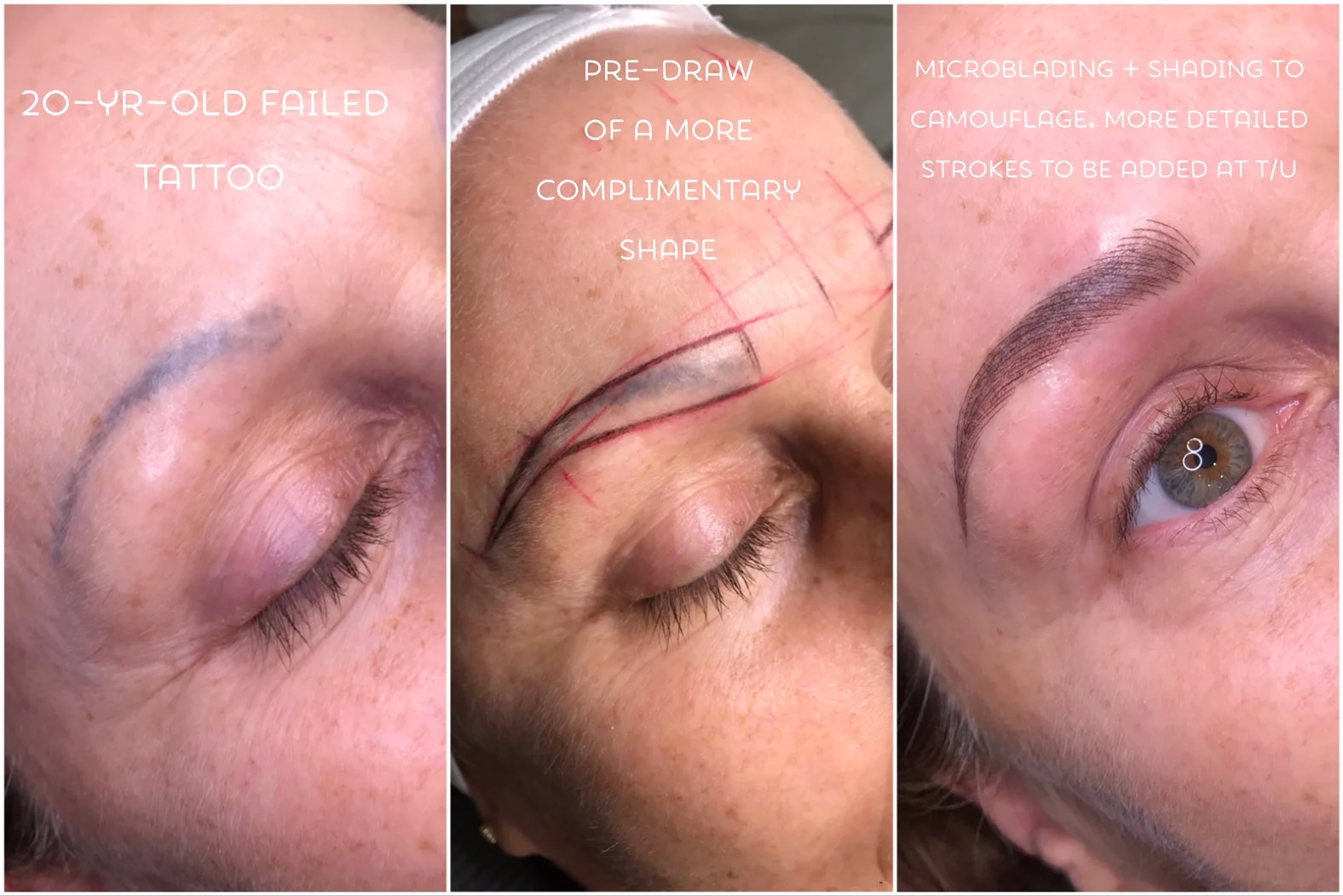 Three-step eyebrow transformation process: left image shows faded 20-year-old tattoo above closed eye, middle image shows pre-drawn new eyebrow shape with red markings, right image shows completed microblading with shaded, natural eyebrow above open