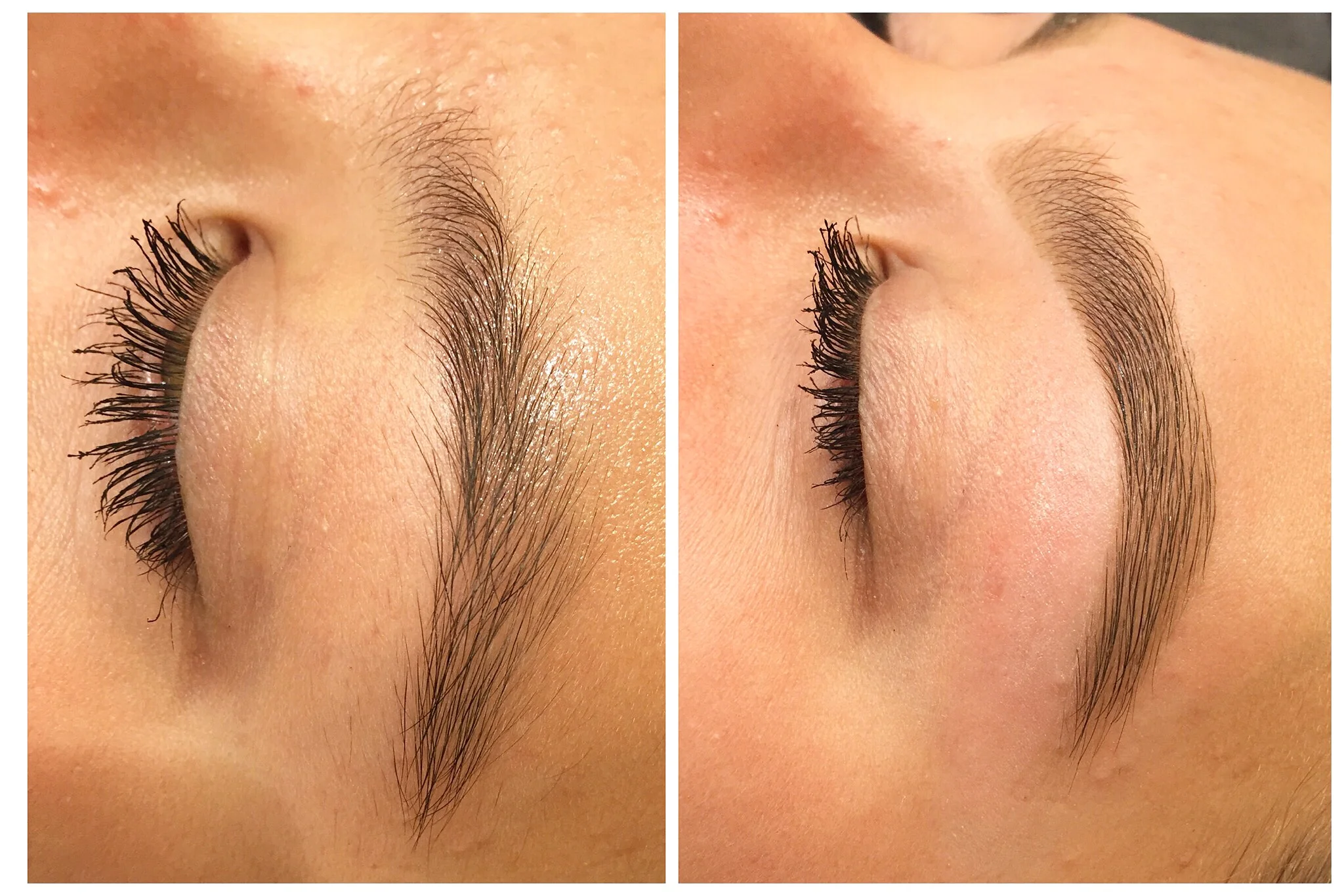 Side-by-side comparison of a woman's face before and after an eyebrow treatment, showing enhanced eyebrow definition.