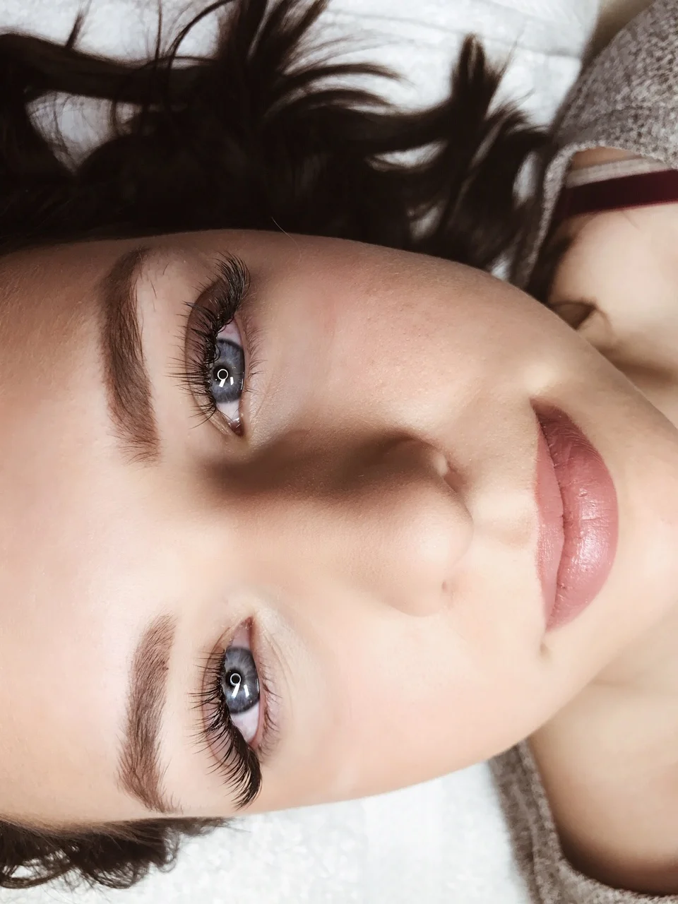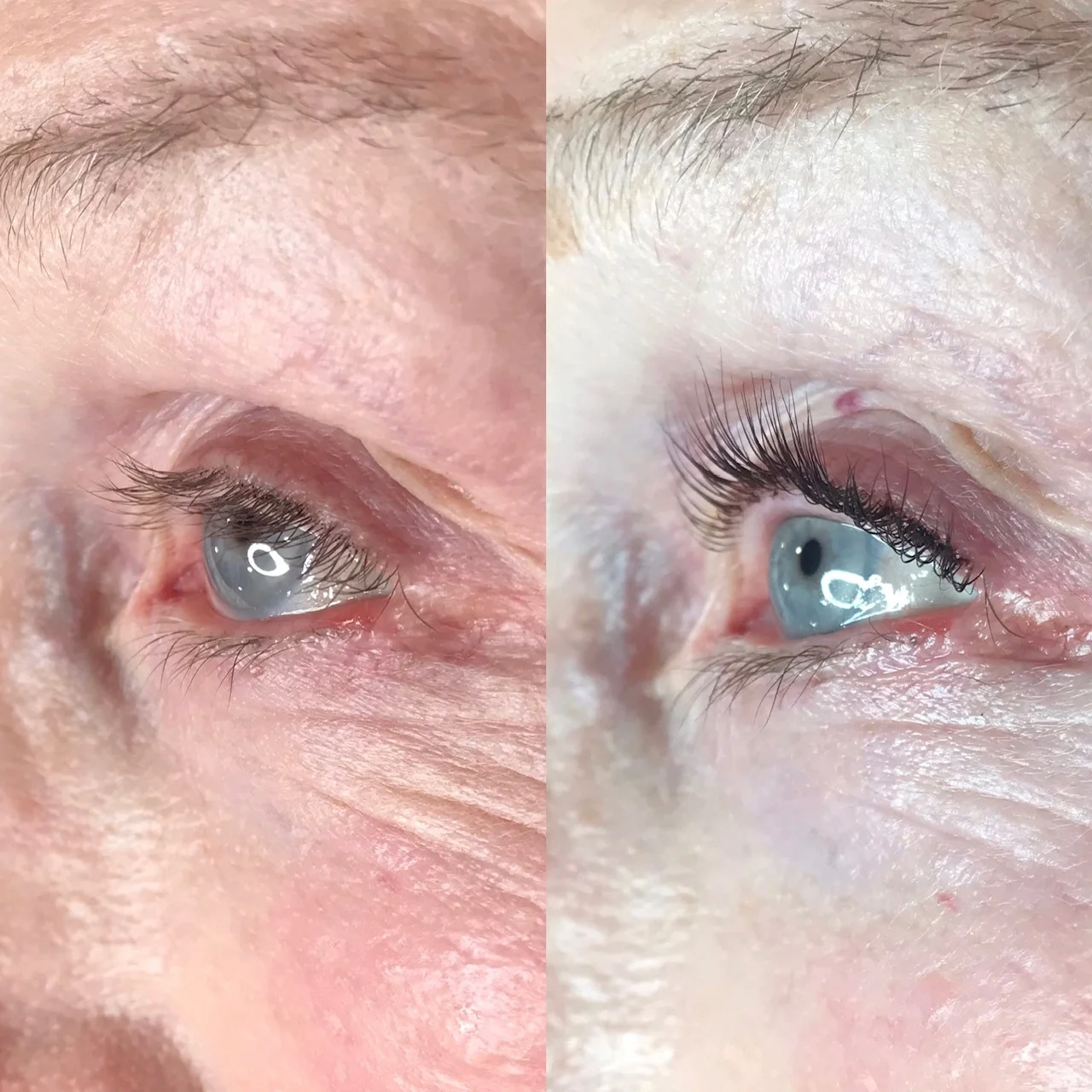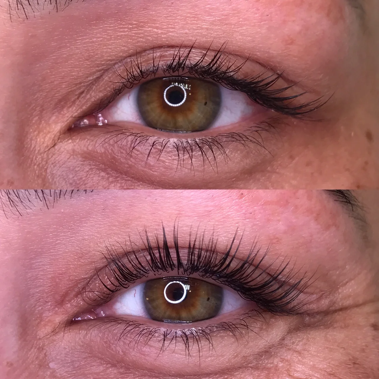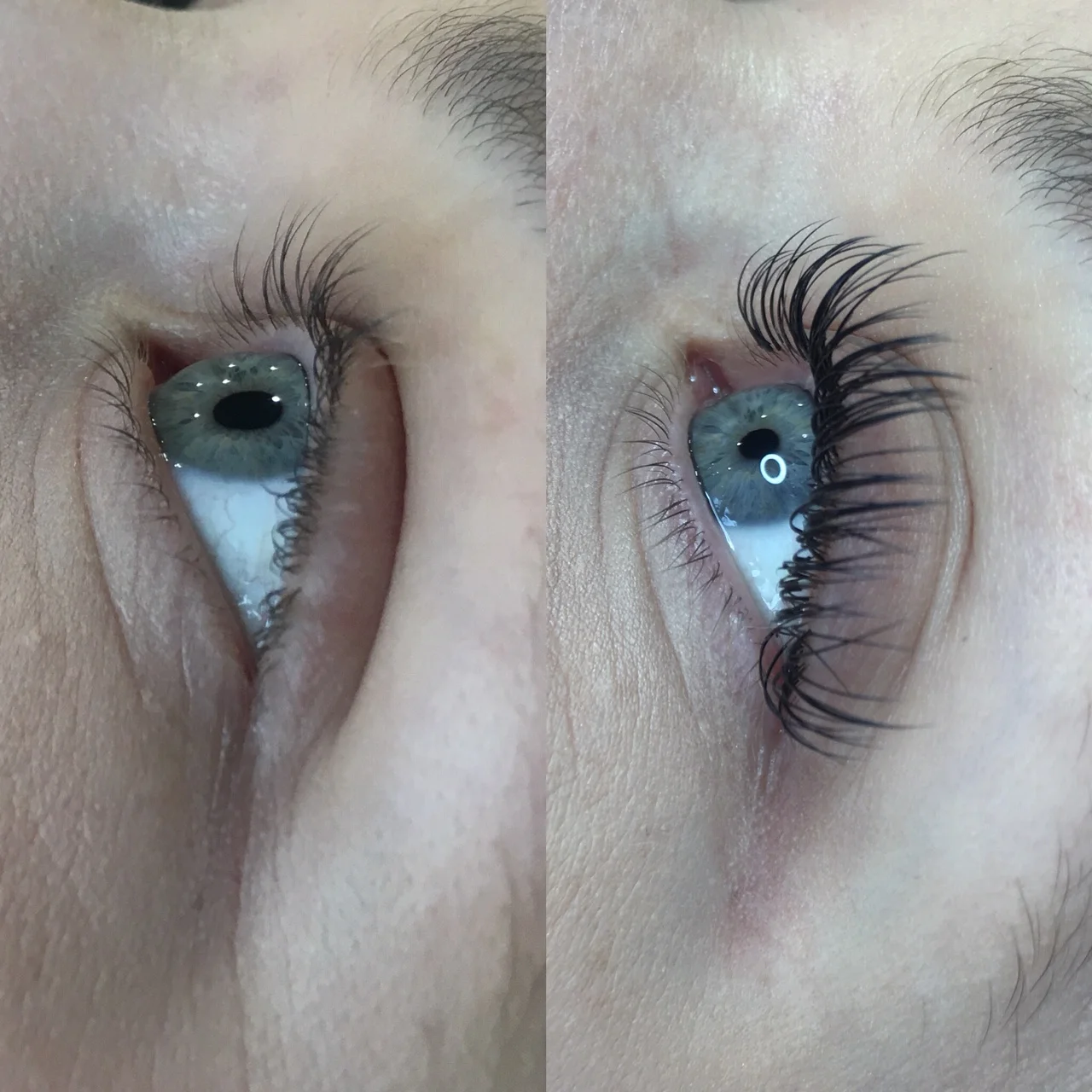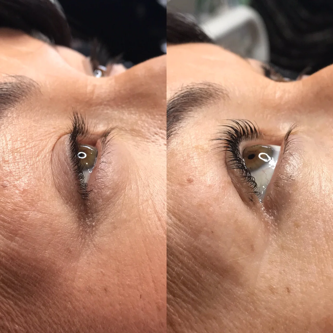 Before and after effects of an eyelash lift with close-up views of an eye showing enhanced and curled eyelashes.